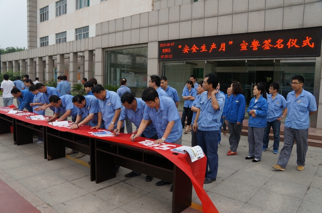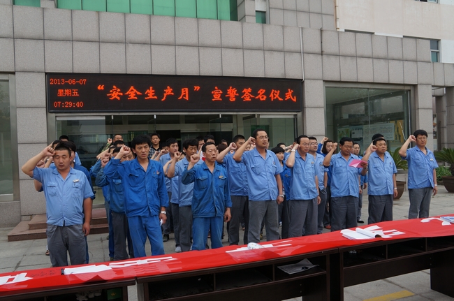 厂级领导、机关部室全体人员、机修车间人员在刘总的带领下宣誓,参加宣誓人员举起右手,紧握拳头进行庄严宣誓。随后在条幅上郑重写下自己的名字,确保安全生产。
